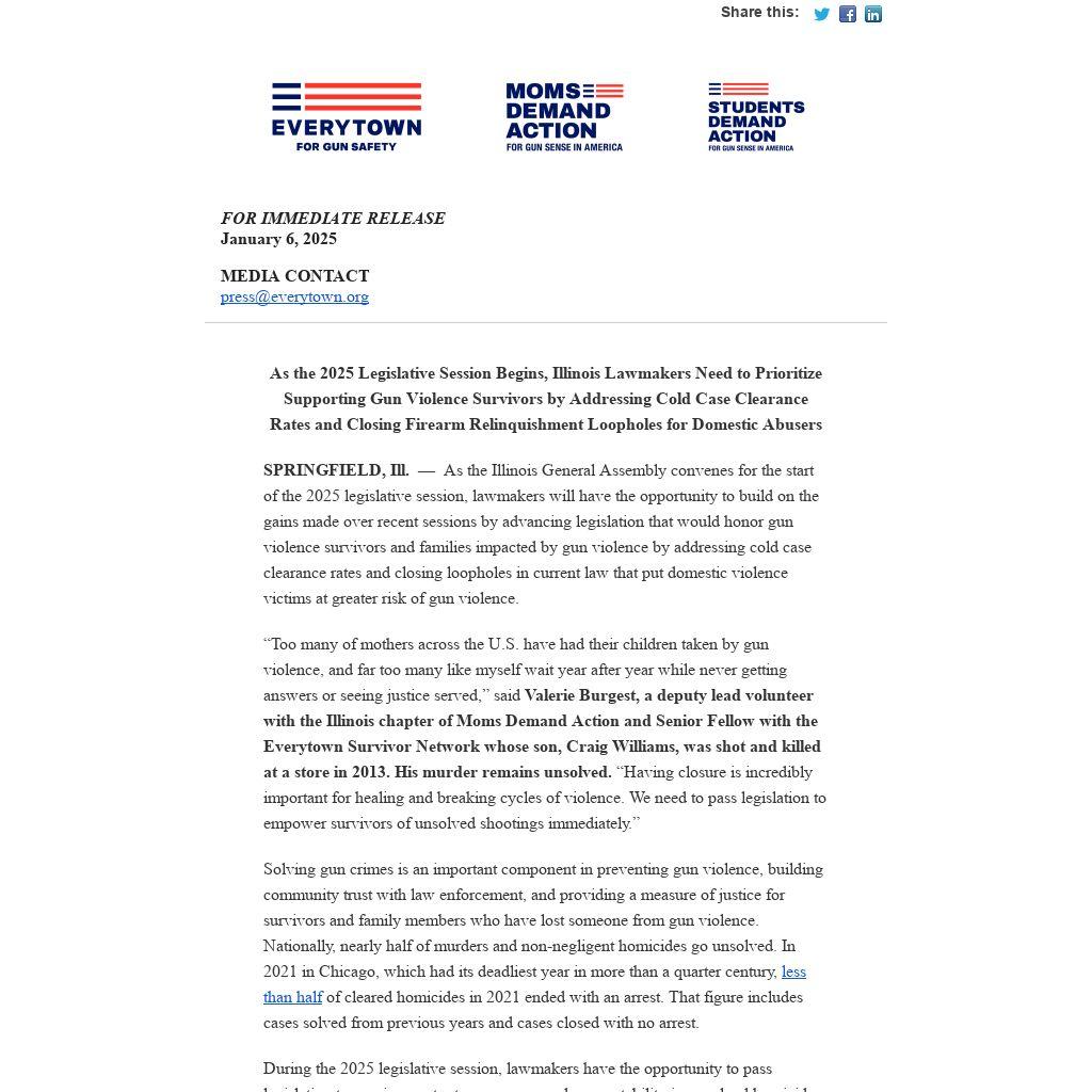SPRINGFIELD, Ill.  —  As the Illinois General Assembly convenes for the start of the 2025 legislative session, lawmakers will have the opportunity to build on the gains made over recent sessions by advancing legislation that would honor gun violence survivors and families impacted by gun violence by addressing cold case clearance rates and closing loopholes in current law that put domestic violence victims at greater risk of gun violence.