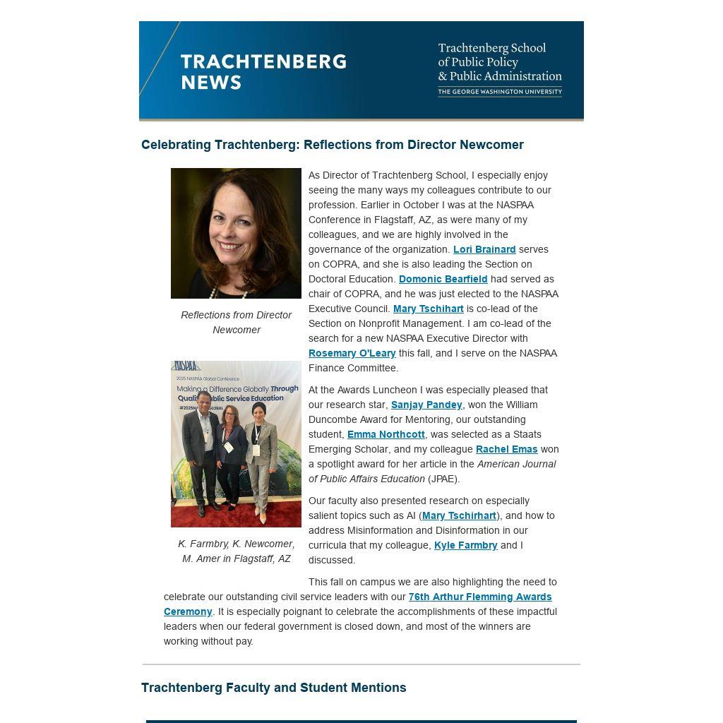As Director of Trachtenberg School, I especially enjoy seeing the many ways my colleagues contribute to our profession. Earlier in October I was at the NASPAA Conference in Flagstaff, AZ, as were many of my colleagues, and we are highly involved in the governance of the organization. Lori Brainard serves on COPRA, and she is also leading the Section on Doctoral Education. Domonic Bearfield had served as chair of COPRA, and he was just elected to the NASPAA Executive Council. Mary Tschihart is co-lead of the Section on Nonprofit Management. I am co-lead of the search for a new NASPAA Executive Director with Rosemary O'Leary this fall, and I serve on the NASPAA Finance Committee.