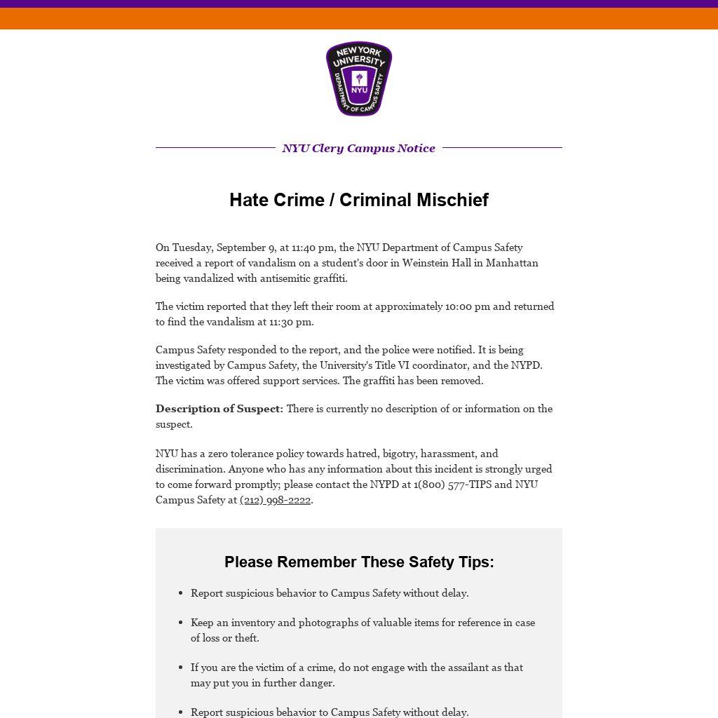On Tuesday, September 9, at 11:40 pm, the NYU Department of Campus Safety received a report of vandalism on a student's door in Weinstein Hall in Manhattan being vandalized with antisemitic graffiti.