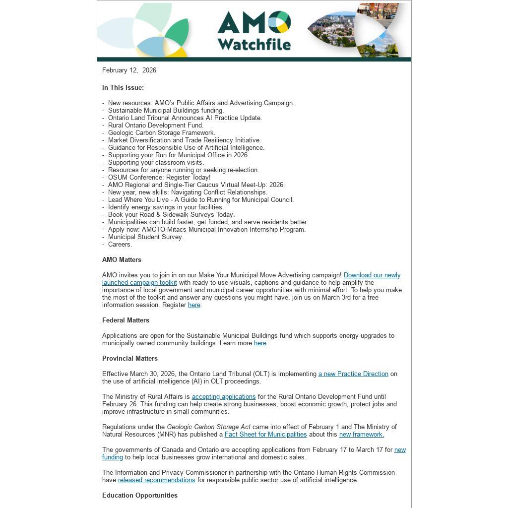 AMO invites you to join in on our Make Your Municipal Move Advertising campaign! with ready-to-use visuals, captions and guidance to help amplify the importance of local government and municipal career opportunities with minimal effort. To help you make the most of the toolkit and answer any questions you might have, join us on March 3rd for a free information session. Register .