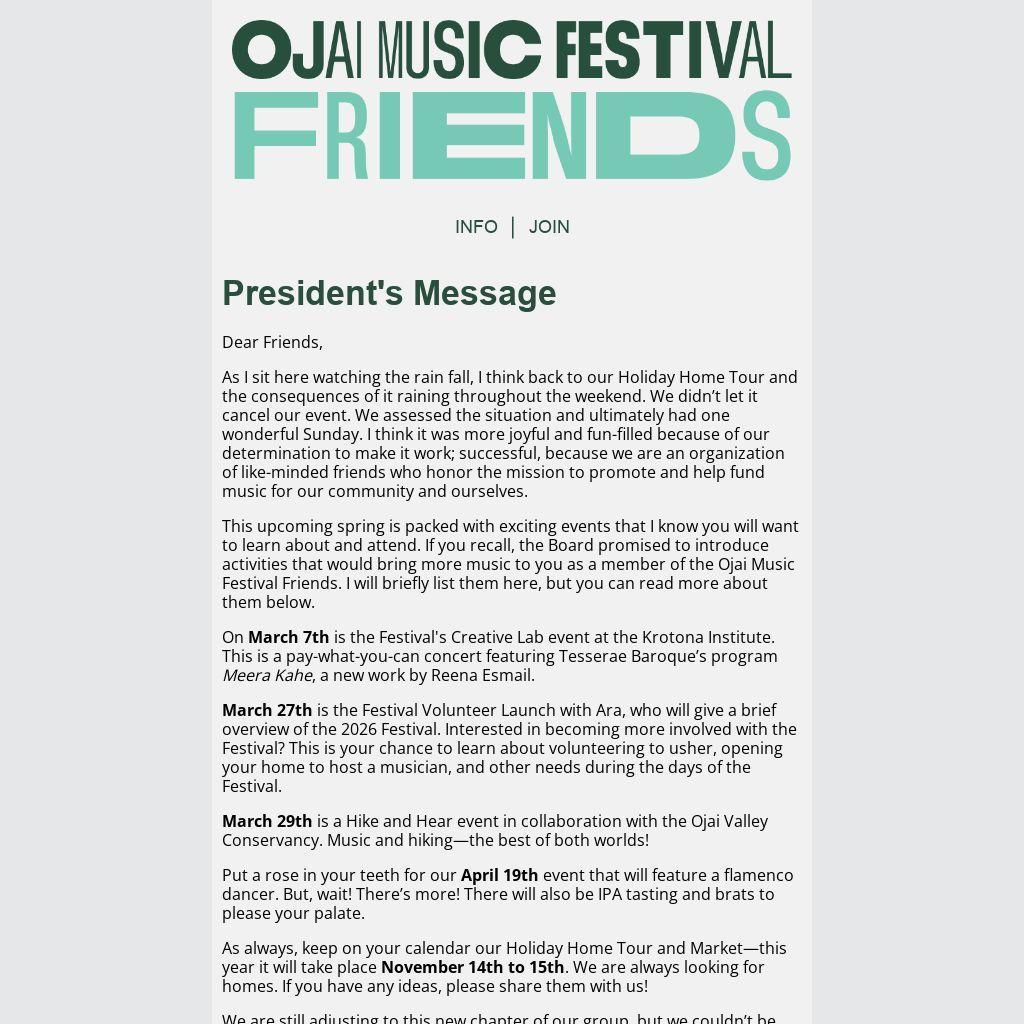 We are still adjusting to this new chapter of our group, but we couldn’t be more thrilled with how our membership is growing with new friends. Spread the word about us—We are the Ojai Music Festival Friends, and we welcome everyone!
