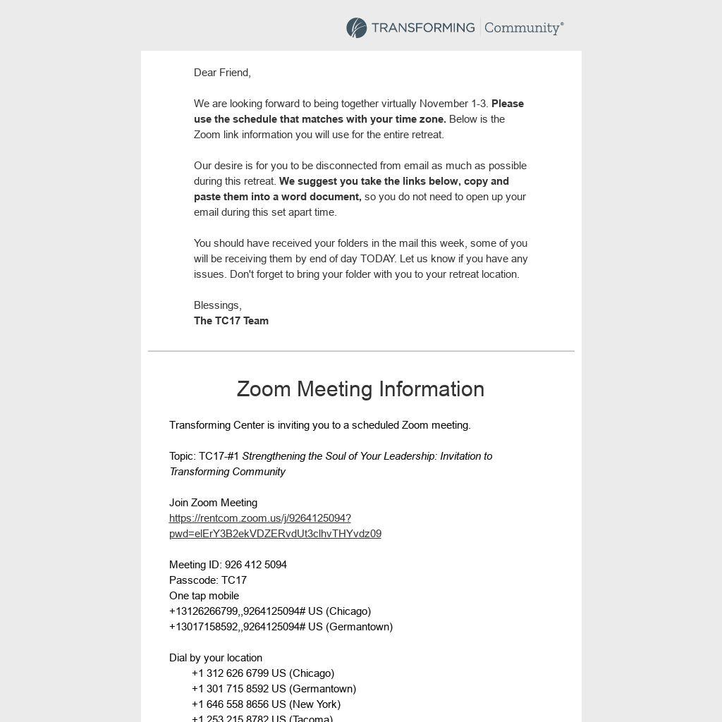 We are looking forward to being together virtually November 1-3. Please use the schedule that matches with your time zone. Below is the Zoom link information you will use for the entire retreat.