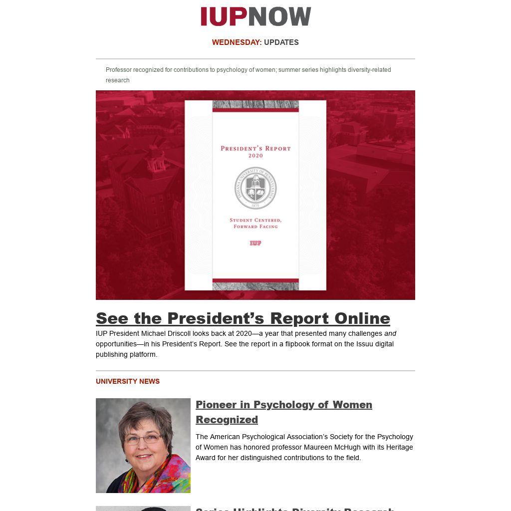 Distributed to IUP employees and students three days a week on its summer schedule, IUP Now is the official newsletter of Indiana University of Pennsylvania. It features news from across the IUP website, compiled by the Division of Marketing and Communications. Find out how to get your news and events in IUP Now.
