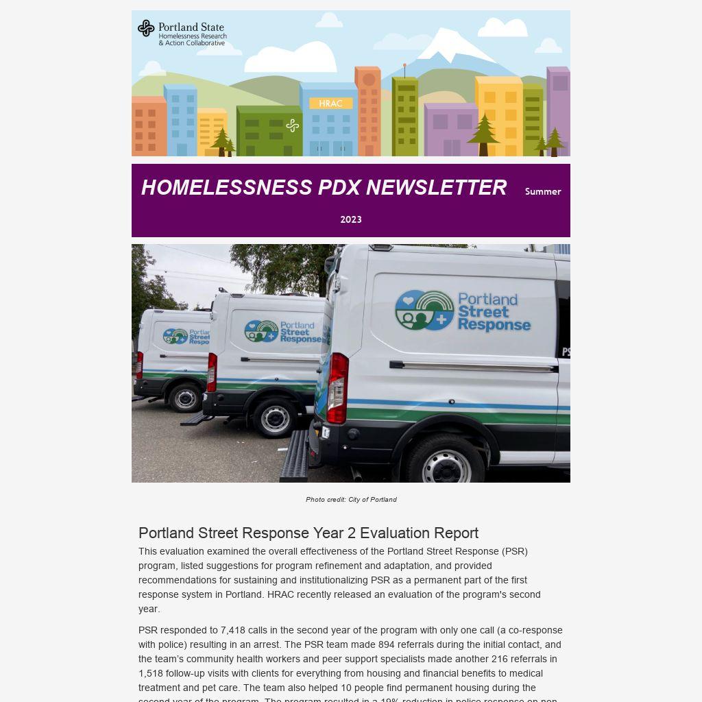 This evaluation examined the overall effectiveness of the Portland Street Response (PSR) program, listed suggestions for program refinement and adaptation, and provided recommendations for sustaining and institutionalizing PSR as a permanent part of the first response system in Portland. HRAC recently released an evaluation of the program's second year.