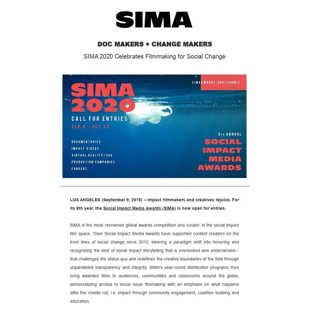 LOS ANGELES (September 9, 2019) – Impact filmmakers and creatives rejoice. For its 8th year, the Social Impact Media Awards (SIMA) is now open for entries.