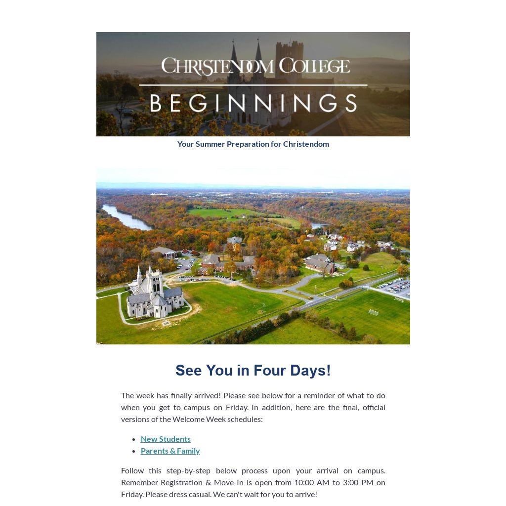 Before driving to your residence hall, please proceed first to check in at the John Paul the Great Student Center. Pull into campus at the second entrance past the Chapel, where the large "Christendom College" sign and four tall flag polls stand. A Welcome Weekend Committee volunteer will direct you to the Student Center.