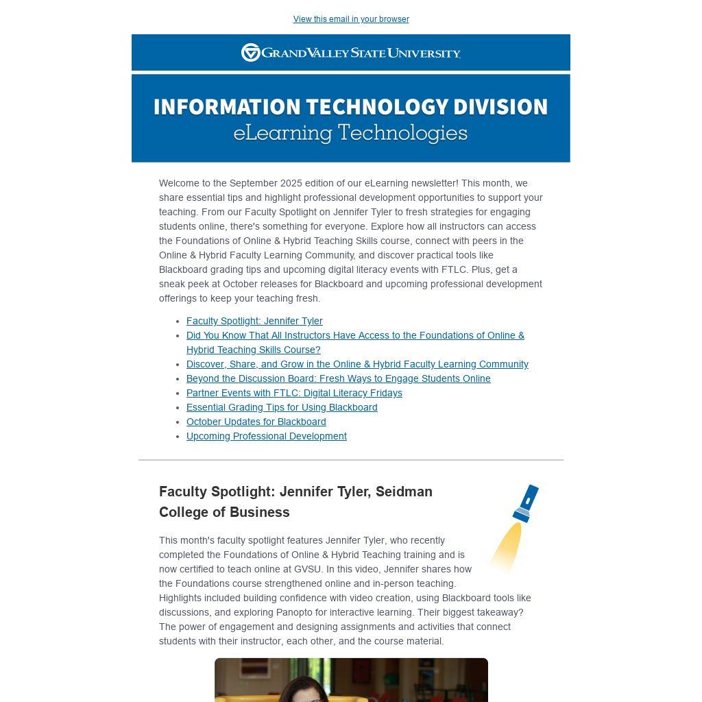 Welcome to the September 2025 edition of our eLearning newsletter! This month, we share essential tips and highlight professional development opportunities to support your teaching. From our Faculty Spotlight on Jennifer Tyler to fresh strategies for engaging students online, there's something for everyone. Explore how all instructors can access the Foundations of Online & Hybrid Teaching Skills course, connect with peers in the Online & Hybrid Faculty Learning Community, and discover practical tools like Blackboard grading tips and upcoming digital literacy events with FTLC. Plus, get a sneak peek at October releases for Blackboard and upcoming professional development offerings to keep your teaching fresh.