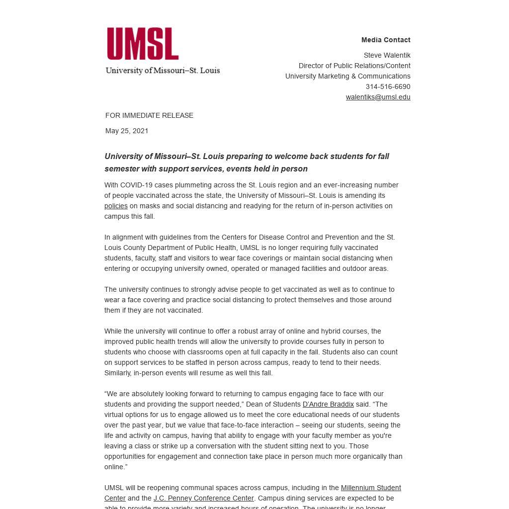 With COVID-19 cases plummeting across the St. Louis region and an ever-increasing number of people vaccinated across the state, the University of Missouri–St. Louis is amending its policies on masks and social distancing and readying for the return of in-person activities on campus this fall.