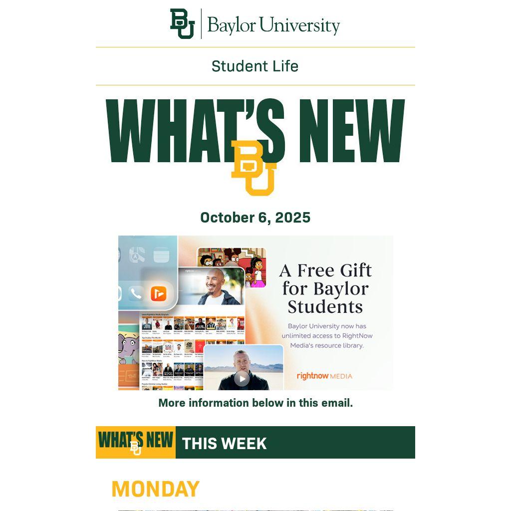 If you are a department or Baylor student organization and have items you would like to see appear in What's New BU, submit them for consideration by Friday at 8 a.m. by clicking here or emailing them to whatsnew@baylor.edu. View past issues of What’s New BU here.