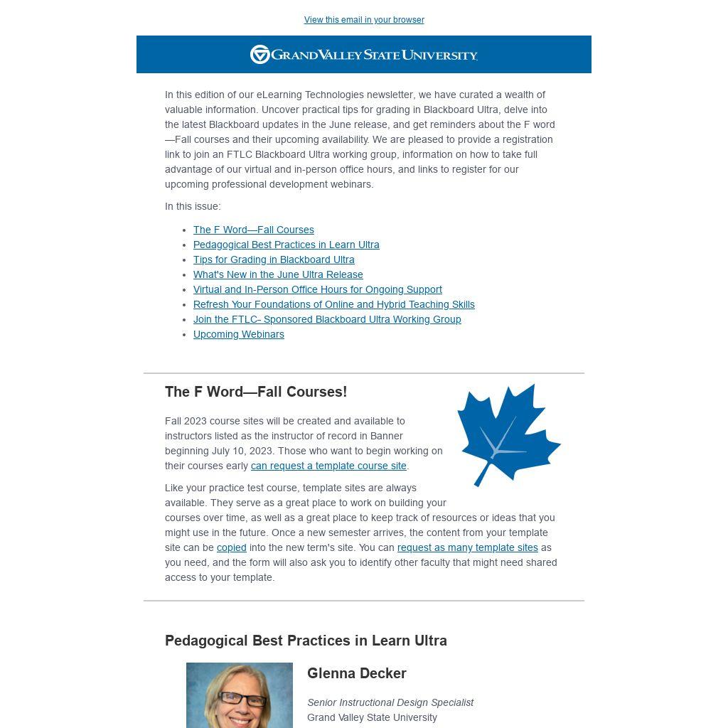 In this edition of our eLearning Technologies newsletter, we have curated a wealth of valuable information. Uncover practical tips for grading in Blackboard Ultra, delve into the latest Blackboard updates in the June release, and get reminders about the F word—Fall courses and their upcoming availability. We are pleased to provide a registration link to join an FTLC Blackboard Ultra working group, information on how to take full advantage of our virtual and in-person office hours, and links to register for our upcoming professional development webinars.