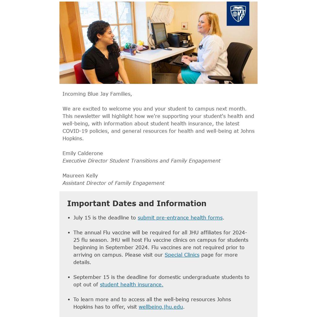 We are excited to welcome you and your student to campus next month. This newsletter will highlight how we're supporting your student's health and well-being, with information about student health insurance, the latest COVID-19 policies, and general resources for health and well-being at Johns Hopkins.