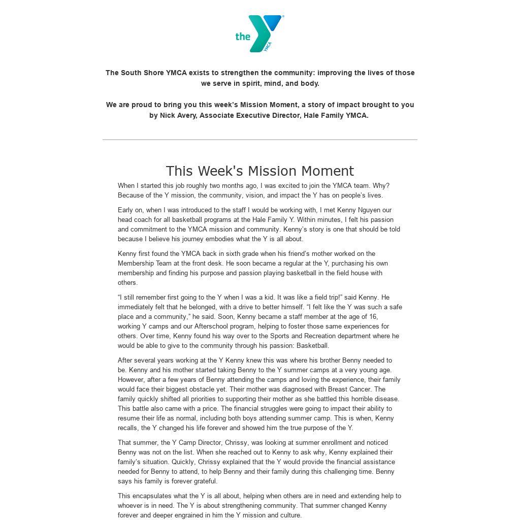 This encapsulates what the Y is all about, helping when others are in need and extending help to whoever is in need. The Y is about strengthening community. That summer changed Kenny forever and deeper engrained in him the Y mission and culture.