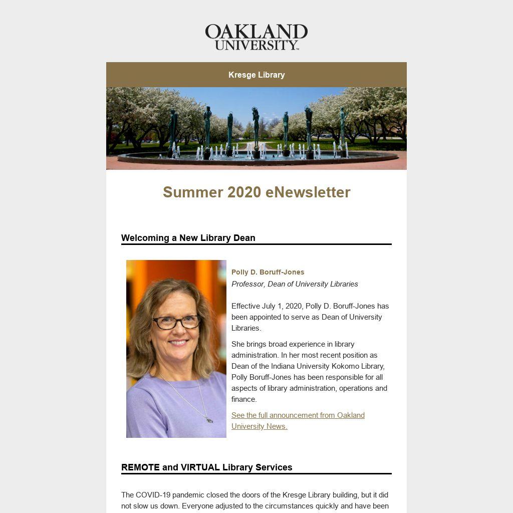 The COVID-19 pandemic closed the doors of the Kresge Library building, but it did not slow us down. Everyone adjusted to the circumstances quickly and have been going above and beyond to support each other and our patrons. Library faculty and staff are offering amazing virtual services and electronic resources to the Oakland University community as we work on plans for a phased re-opening of the building.