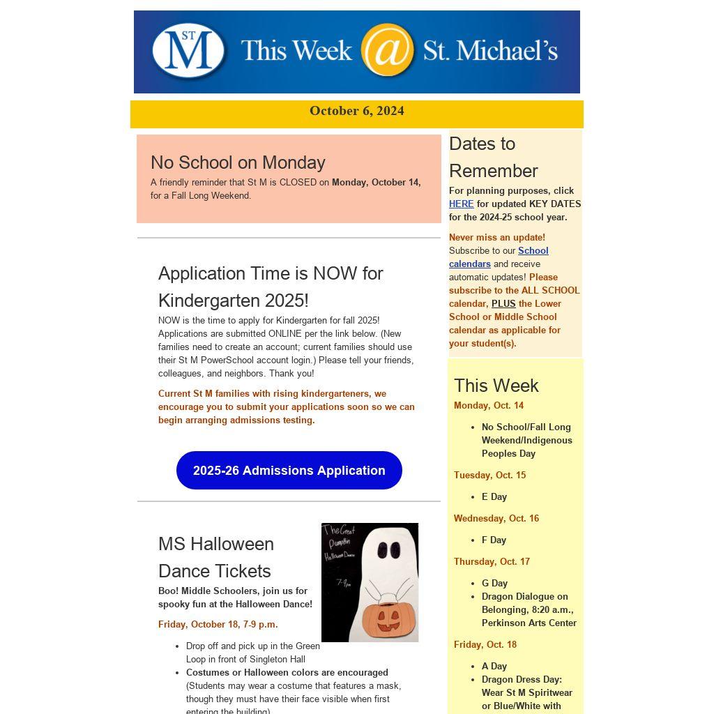 NOW is the time to apply for Kindergarten for fall 2025! Applications are submitted ONLINE per the link below. (New families need to create an account; current families should use their St M PowerSchool account login.) Please tell your friends, colleagues, and neighbors. Thank you!