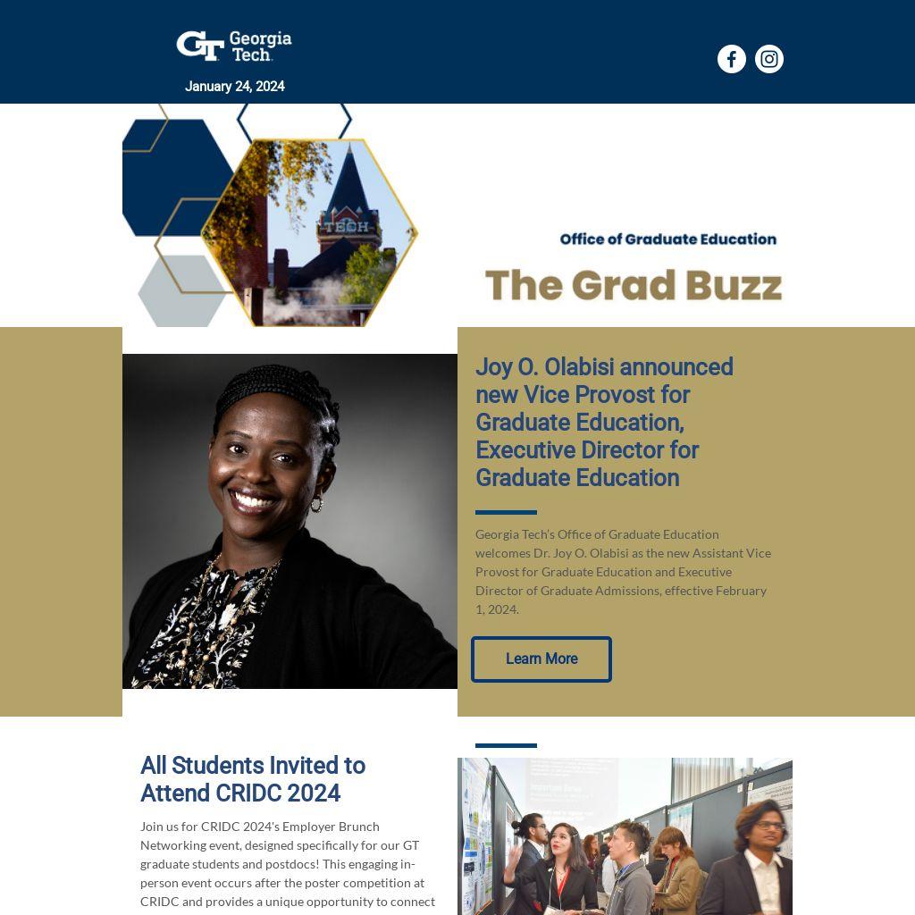 Georgia Tech’s Office of Graduate Education welcomes Dr. Joy O. Olabisi as the new Assistant Vice Provost for Graduate Education and Executive Director of Graduate Admissions, effective February 1, 2024.