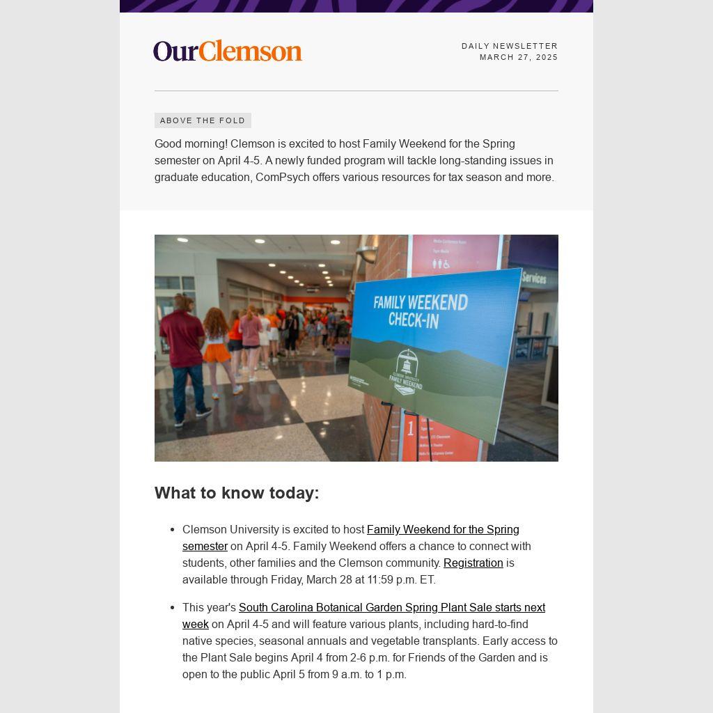 Good morning! Clemson is excited to host Family Weekend for the Spring semester on April 4-5. A newly funded program will tackle long-standing issues in graduate education, ComPsych offers various resources for tax season and more.
