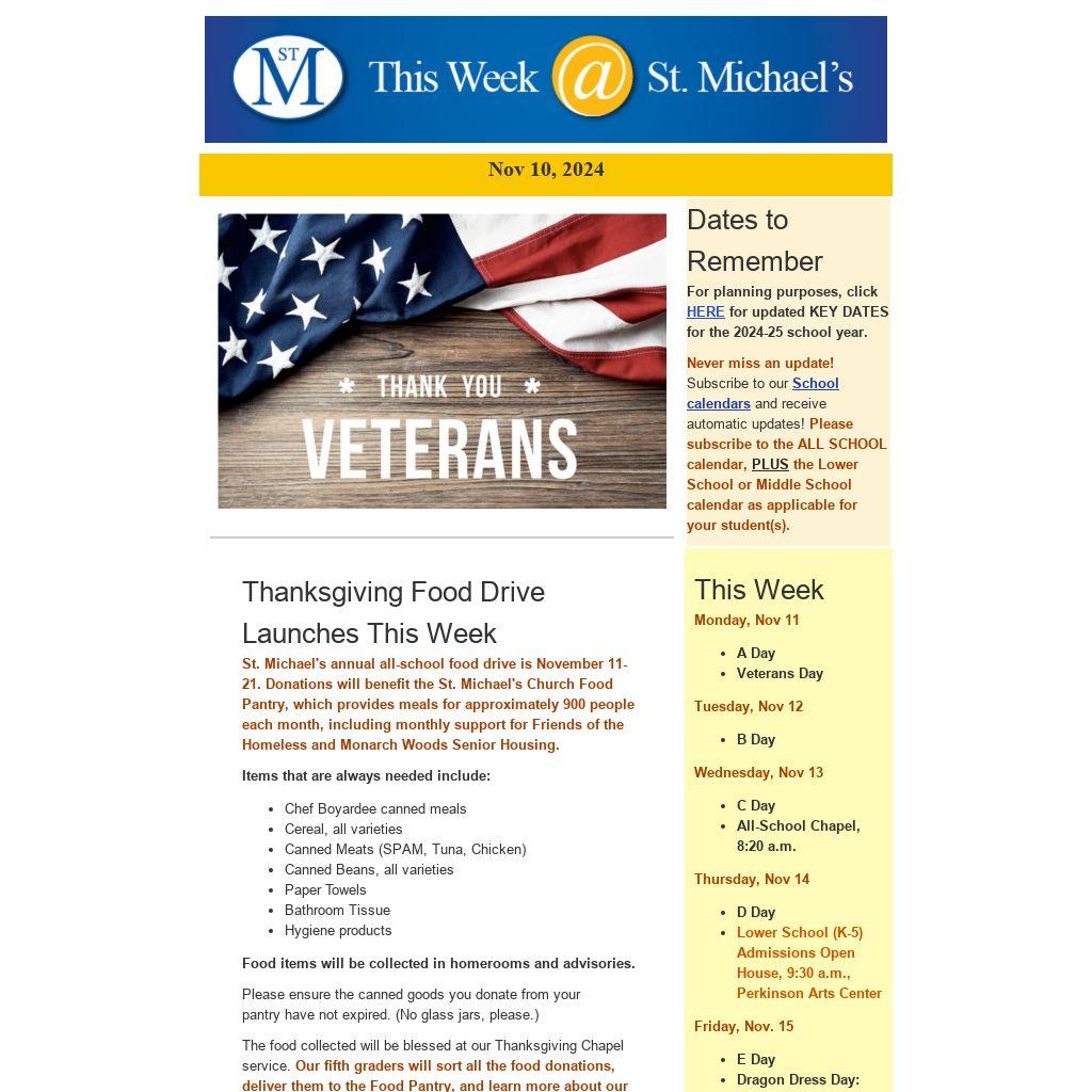 Thanksgiving Food Drive Launches This WeekSt. Michael's annual all-school food drive is November 11-21. Donations will benefit the St. Michael's Church Food Pantry, which provides meals for approximately 900 people each month, including monthly support for Friends of the Homeless and Monarch Woods Senior Housing.