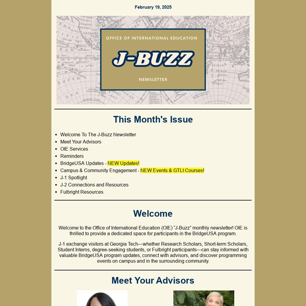 Welcome to the Office of International Education (OIE) “J-Buzz” monthly newsletter! OIE is thrilled to provide a dedicated space for participants in the BridgeUSA program.