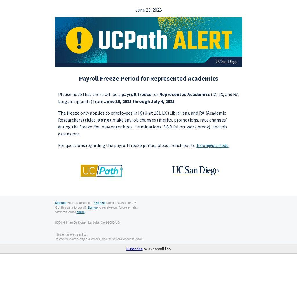 For questions regarding the payroll freeze period, please reach out to hzion@ucsd.edu.