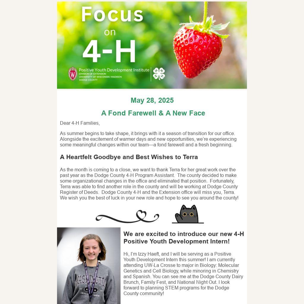 As the month is coming to a close, we want to thank Terra for her great work over the past year as the Dodge County 4-H Program Assistant. The county decided to make some organizational changes in the office and eliminated that position. Fortunately, Terra was able to find another role in the county and will be working at Dodge County Register of Deeds. Dodge County 4-H and the Extension office will miss you, Terra. We wish you the best of luck in your new role and hope to see you around the county!