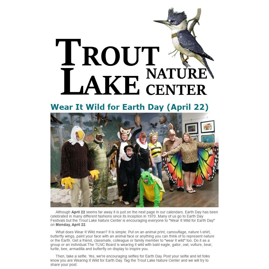 Although April 22 seems far away it is just on the next page in our calendars. Earth Day has been celebrated in many different fashions since its inception in 1970. Many of us go to Earth Day Festivals but the Trout Lake Nature Center is encouraging everyone to "Wear It Wild for Earth Day" on Monday, April 22.