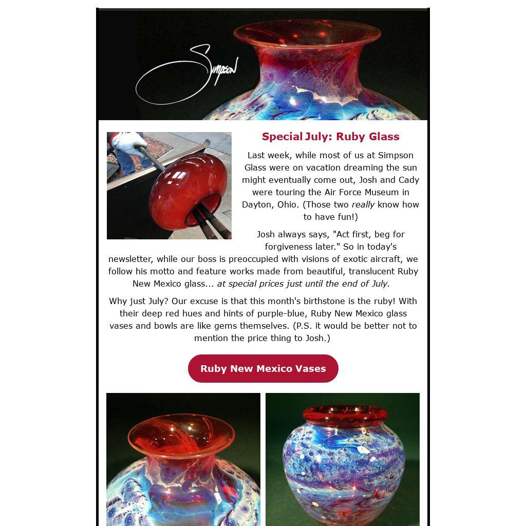 Josh always says, "Act first, beg for forgiveness later." So in today's newsletter, while our boss is preoccupied with visions of exotic aircraft, we follow his motto and feature works made from beautiful, translucent Ruby New Mexico glass... at special prices just until the end of July.