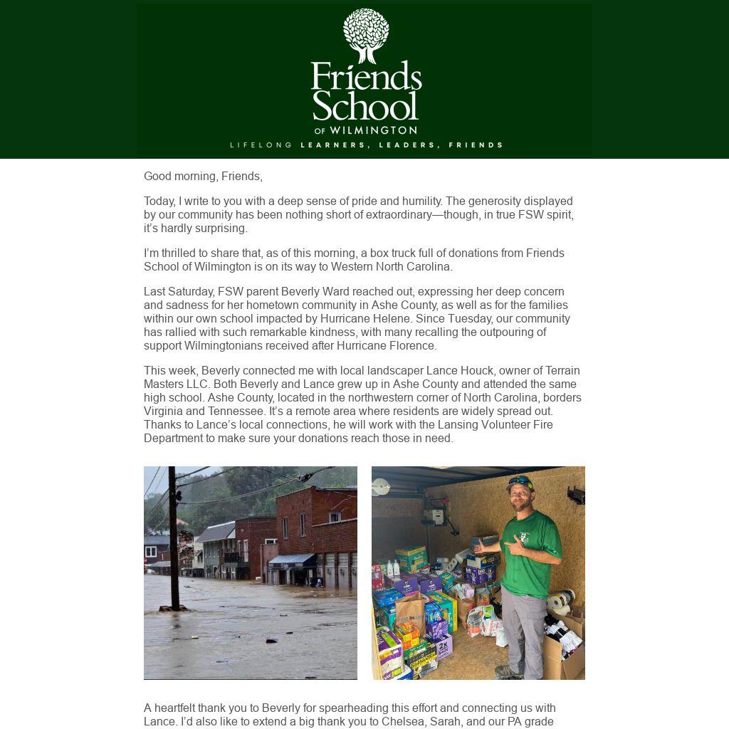 Last Saturday, FSW parent Beverly Ward reached out, expressing her deep concern and sadness for her hometown community in Ashe County, as well as for the families within our own school impacted by Hurricane Helene. Since Tuesday, our community has rallied with such remarkable kindness, with many recalling the outpouring of support Wilmingtonians received after Hurricane Florence.