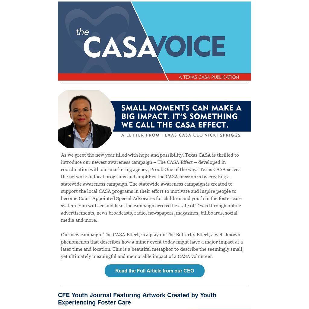 As we greet the new year filled with hope and possibility, Texas CASA is thrilled to introduce our newest awareness campaign – The CASA Effect – developed in coordination with our marketing agency, Proof. One of the ways Texas CASA serves the network of local programs and amplifies the CASA mission is by creating a statewide awareness campaign. The statewide awareness campaign is created to support the local CASA programs in their effort to motivate and inspire people to become Court Appointed Special Advocates for children and youth in the foster care system. You will see and hear the campaign across the state of Texas through online advertisements, news broadcasts, radio, newspapers, magazines, billboards, social media and more.