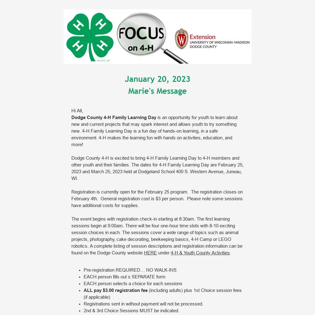 Dodge County 4-H is excited to bring 4-H Family Learning Day to 4-H members and other youth and their families. The dates for 4-H Family Learning Day are February 25, 2023 and March 25, 2023 held at Dodgeland School 400 S. Western Avenue, Juneau, WI.