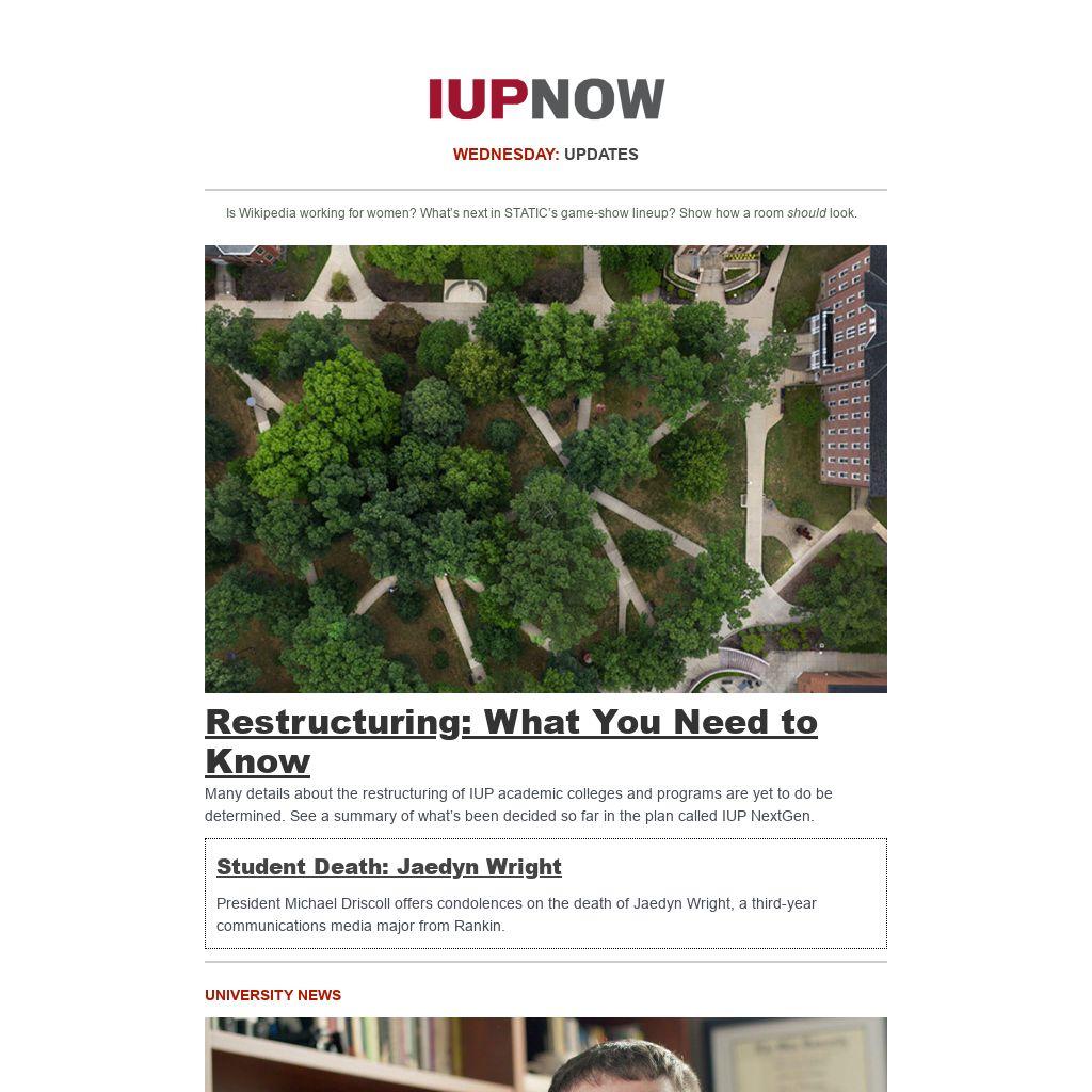 Distributed to IUP employees and students four days a week, IUP Now is the official newsletter of Indiana University of Pennsylvania. It features news from across the IUP website, compiled by the Division of Marketing and Communications. Find out how to get your news and events in IUP Now.