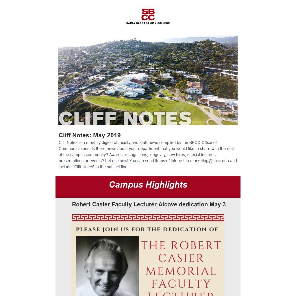 Cliff Notes: May 2019Cliff Notes is a monthly digest of faculty and staff news compiled by the SBCC Office of Communications. Is there news about your department that you would like to share with the rest of the campus community? Awards, recognitions, longevity, new hires, special lectures, presentations or events? Let us know! You can send items of interest to marketing@sbcc.edu and include "Cliff Notes" in the subject line.