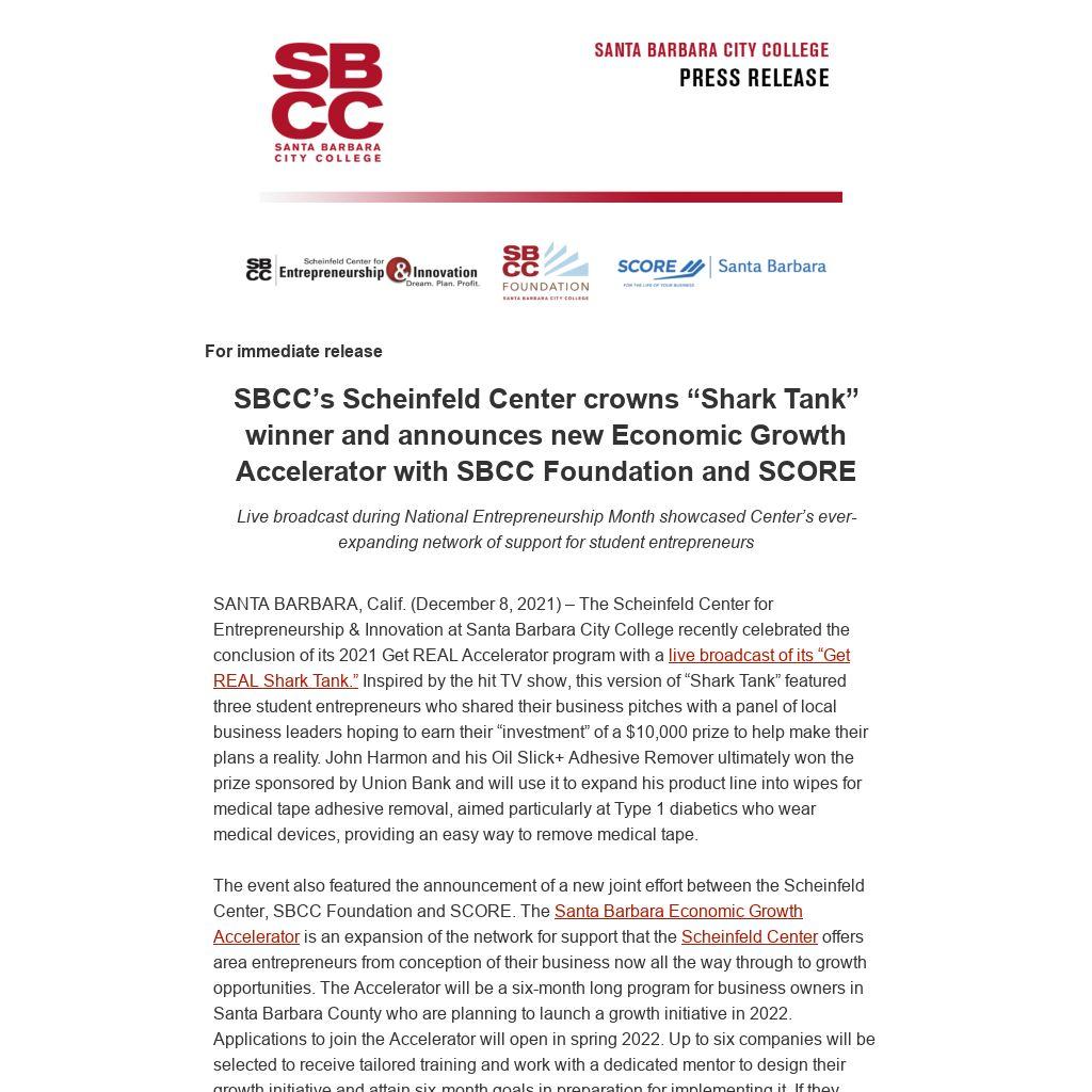 SBCC’s Scheinfeld Center crowns “Shark Tank” winner and announces new Economic Growth Accelerator with SBCC Foundation and SCORE