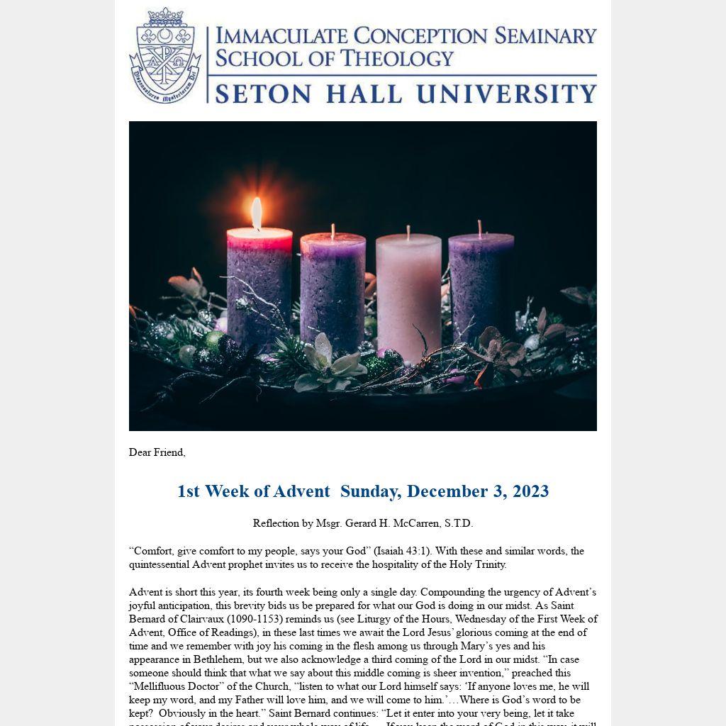 Extending hospitality to the Lord Jesus ends in his offering us a share in the communion he enjoys with the Father and the Holy Spirit. Our small gesture of hospitality, made possible by his grace in the first place, brings us into the hospitality of God. During Advent we hear the voices of the prophets, especially Isaiah, who will lead us through the first two weeks of the Advent readings, even determining the choice of the Gospel readings (as happens only in this time of the Liturgical Year), who invite us to open our hearts to God who has opened his heart to us. Their clarion call finds singular expression in John the Baptist, who ushers us from the Old Testament to the New, where we encounter Joseph and Mary, who give us the most beautiful model of hospitality. Indeed, Mary finds her grace-filled hospitality blessed beyond measure in her Immaculate Conception, a gift to her of God’s own hospitality, and we have the privilege of celebrating this grace on our seminary’s patronal feast day and letting it echo as we honor her as Our Lady of Guadalupe shortly thereafter. With this image of the Blessed Mother with child, we move toward the celebration of Christmas, when “the Word became flesh and dwelt among us” (John 1:14).