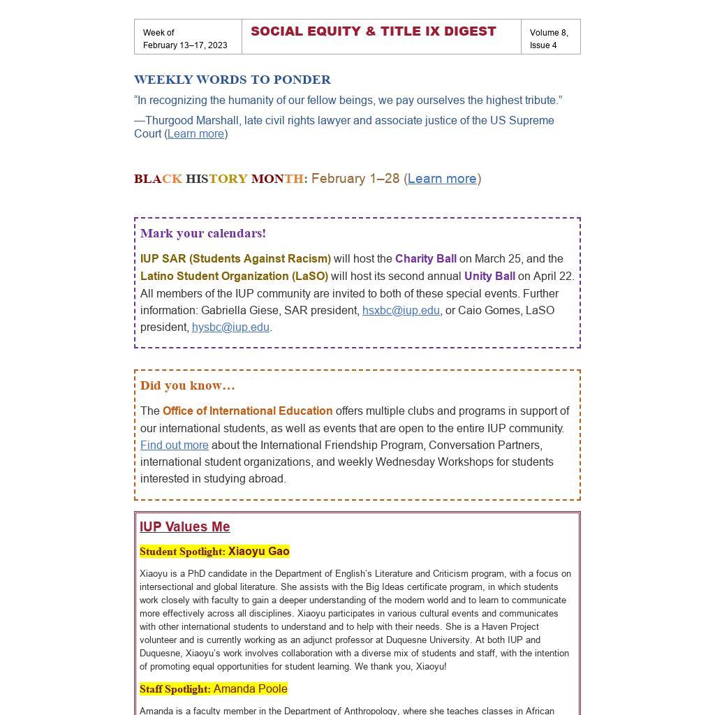 Digest issues are emailed every Monday morning. Send all information concerning your event to social-equity@iup.edu, and we will include it in the appropriate weekly issue. Also, please be sure to enter your event in the CMS on the DIVERSITY, STUDENT, and CENTRAL CALENDARS so that it will receive wider marketing, appear in IUP Now, and achieve greater attendance.