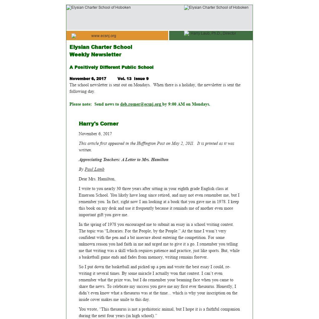 Coin Challenge Starts Next Week - The 2nd Annual Elysian Coin Challenge begins next Monday, November 13! So, start saving your pennies (and nickels, dimes and quarters too!). Containers will be available in every classroom to collect for the challenge!