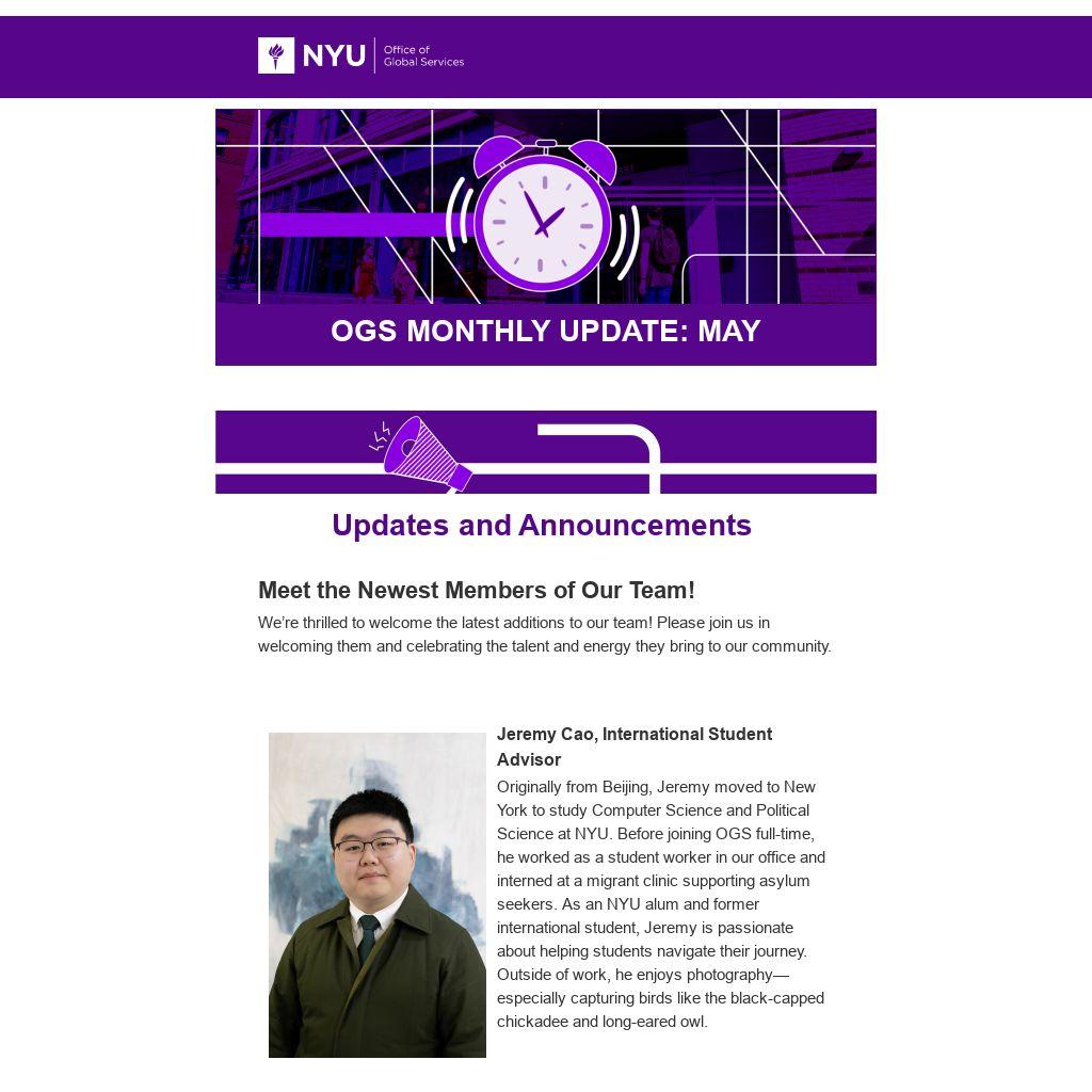 Maddie is a passionate advocate for international education, bringing experience from CU Boulder and Monroe University to her new role at OGS and I-Hub. Originally from Minnesota, she was drawn to NYU’s energy and welcoming community. When not at work, you can find Maddie hiking, camping, gardening, or traveling—South Africa being a favorite destination where she deepened her passion for Peace and Conflict Studies and international education.