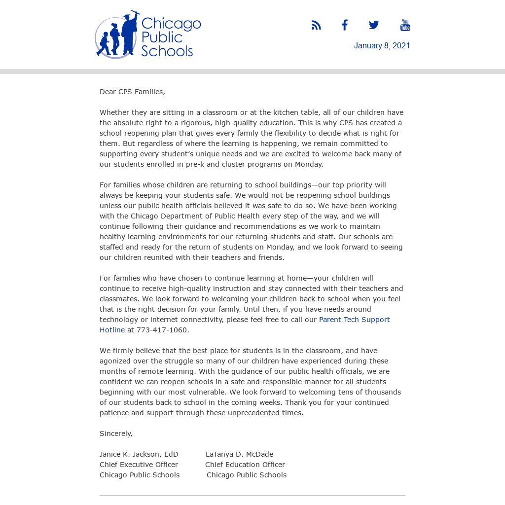 For families whose children are returning to school buildings—our top priority will always be keeping your students safe. We would not be reopening school buildings unless our public health officials believed it was safe to do so. We have been working with the Chicago Department of Public Health every step of the way, and we will continue following their guidance and recommendations as we work to maintain healthy learning environments for our returning students and staff. Our schools are staffed and ready for the return of students on Monday, and we look forward to seeing our children reunited with their teachers and friends.