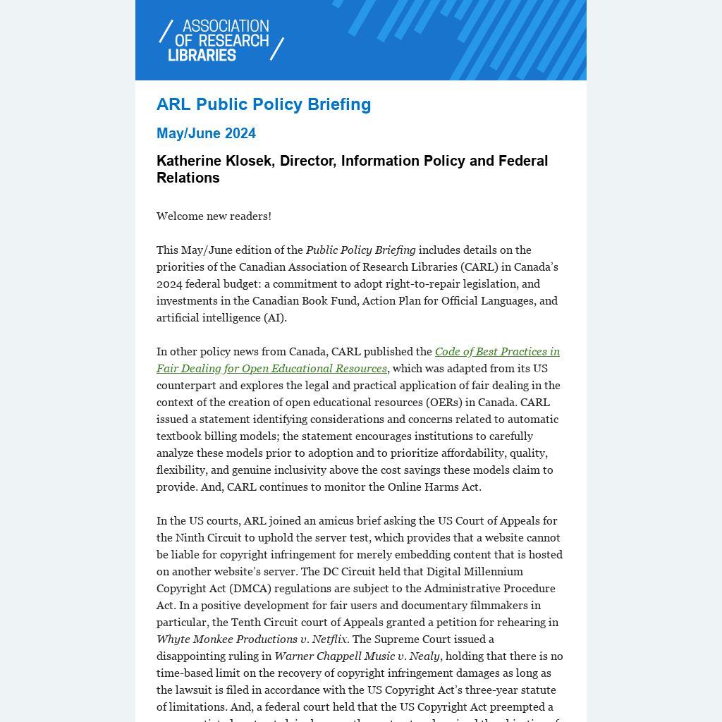 The monthly Public Policy Briefing highlights developments in ARL’s public policy priorities, issues that are relevant to the research library community in the United States and Canada, and details on advocacy conducted by ARL and the Canadian Association of Research Libraries (CARL). Please encourage your colleagues to sign up for the Public Policy Briefing.