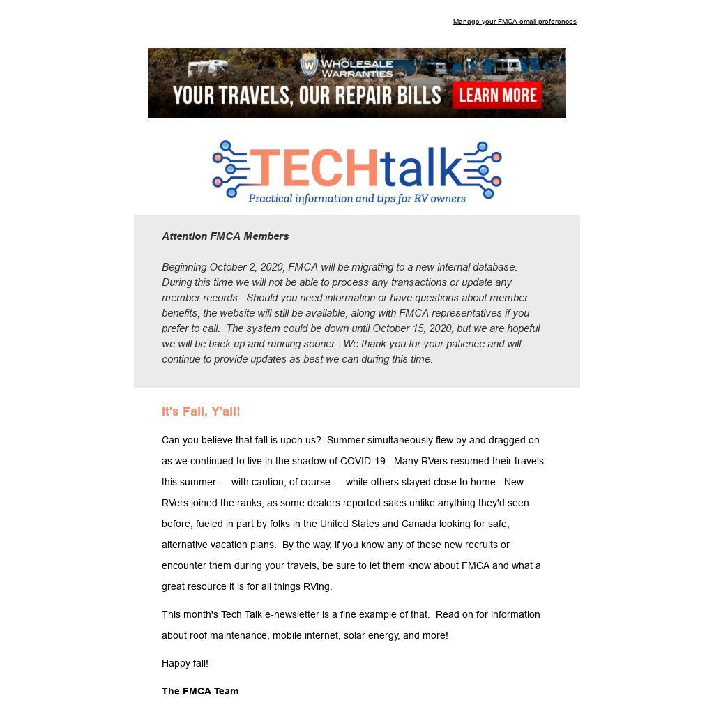 Beginning October 2, 2020, FMCA will be migrating to a new internal database. During this time we will not be able to process any transactions or update any member records. Should you need information or have questions about member benefits, the website will still be available, along with FMCA representatives if you prefer to call. The system could be down until October 15, 2020, but we are hopeful we will be back up and running sooner. We thank you for your patience and will continue to provide updates as best we can during this time.