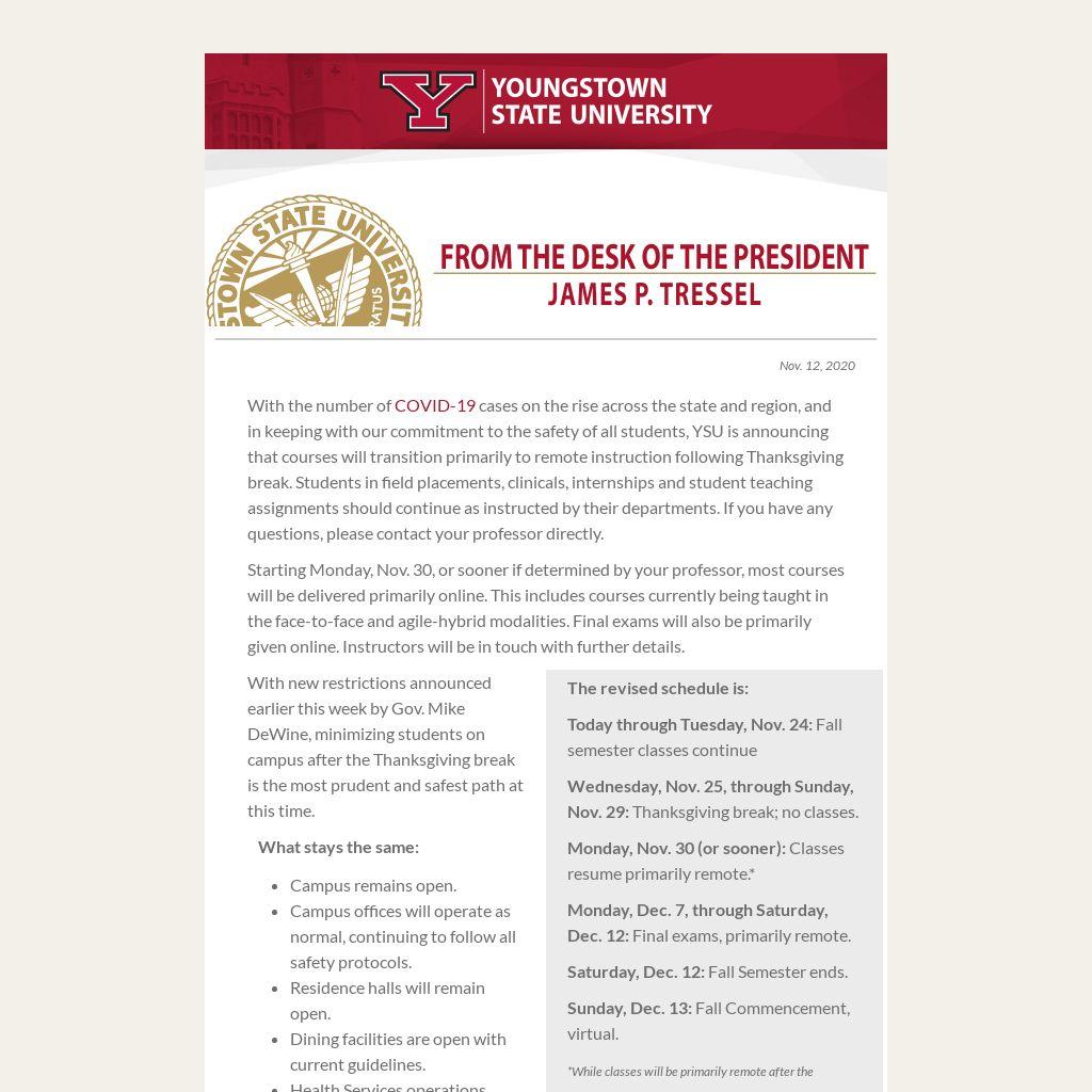 *While classes will be primarily remote after the Thanksgiving break, the campus will remain open, including residence halls and dining facilities. Student support services such as health services, the Center for Student Progress counseling and Maag Library, also remain open after the break.
