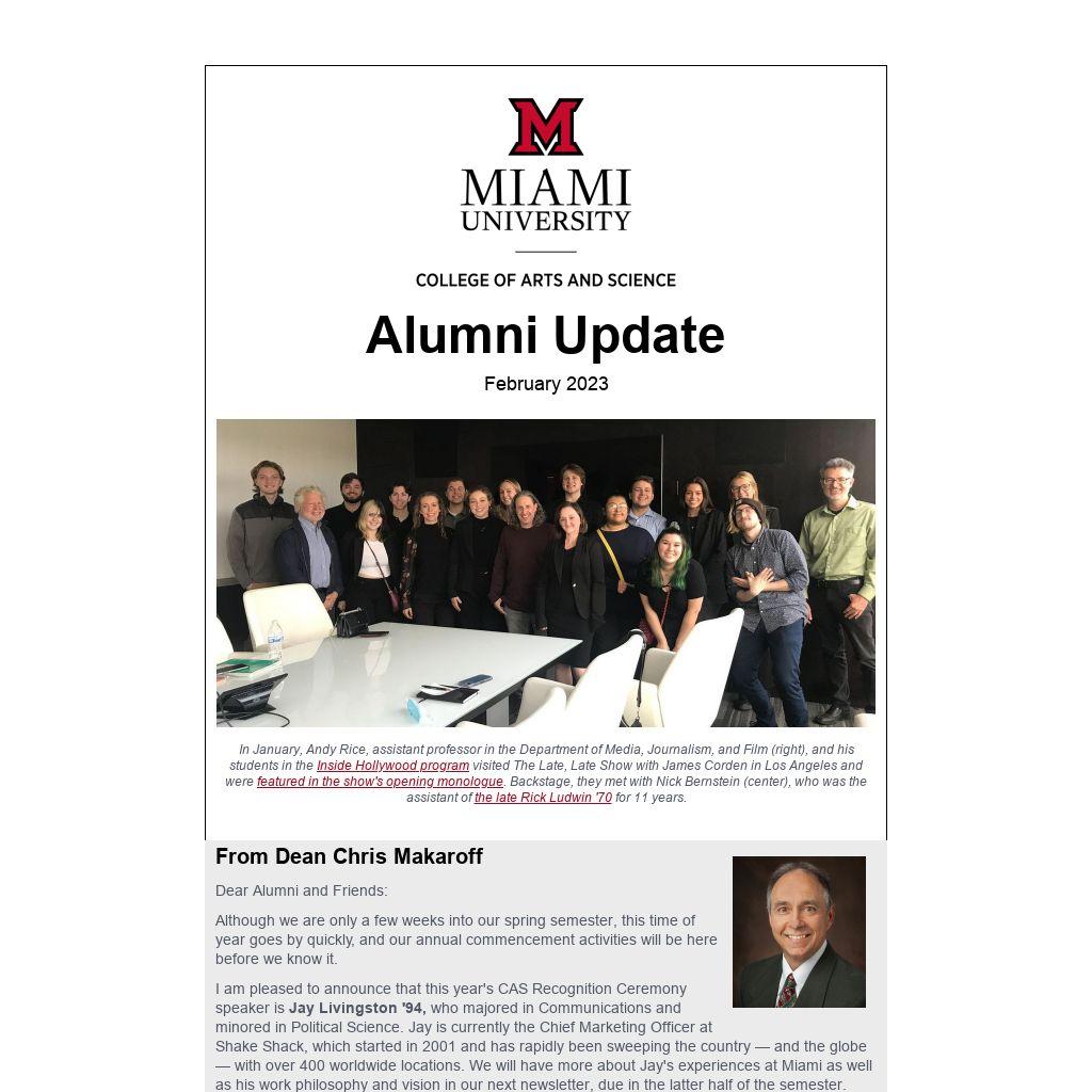 I am pleased to announce that this year's CAS Recognition Ceremony speaker is Jay Livingston '94, who majored in Communications and minored in Political Science. Jay is currently the Chief Marketing Officer at Shake Shack, which started in 2001 and has rapidly been sweeping the country — and the globe — with over 400 worldwide locations. We will have more about Jay's experiences at Miami as well as his work philosophy and vision in our next newsletter, due in the latter half of the semester.