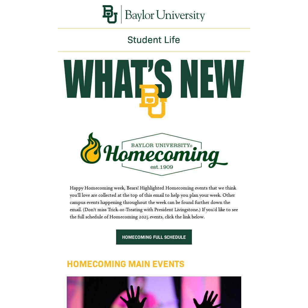 Happy Homecoming week, Bears! Highlighted Homecoming events that we think you'll love are collected at the top of this email to help you plan your week. Other campus events happening throughout the week can be found further down the email. (Don't miss Trick-or-Treating with President Livingstone.) If you'd like to see the full schedule of Homecoming 2025 events, click the link below.