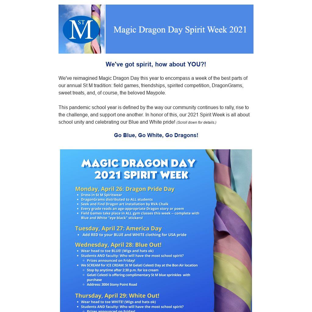 We've reimagined Magic Dragon Day this year to encompass a week of the best parts of our annual St M tradition: field games, friendships, spirited competition, DragonGrams, sweet treats, and, of course, the beloved Maypole.