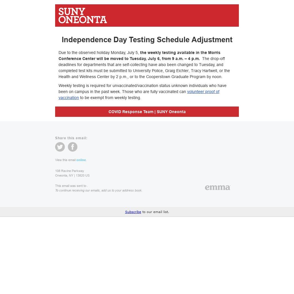 Due to the observed holiday Monday, July 5, the weekly testing available in the Morris Conference Center will be moved to Tuesday, July 6, from 9 a.m. – 4 p.m. The drop-off deadlines for departments that are self-collecting have also been changed to Tuesday, and completed test kits must be submitted to University Police, Graig Eichler, Tracy Hartwell, or the Health and Wellness Center by 2 p.m., or to the Cooperstown Graduate Program by noon.