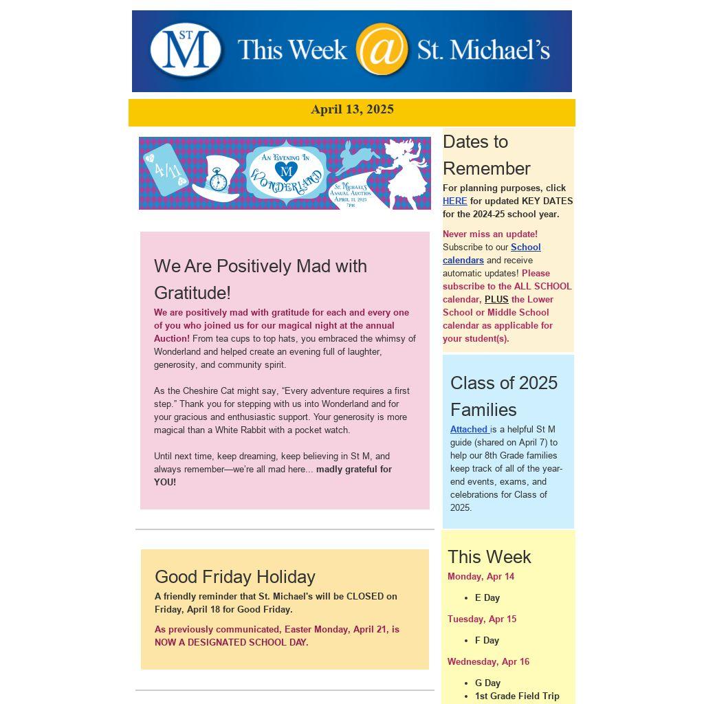A friendly reminder that St. Michael's will be CLOSED on Friday, April 18 for Good Friday.