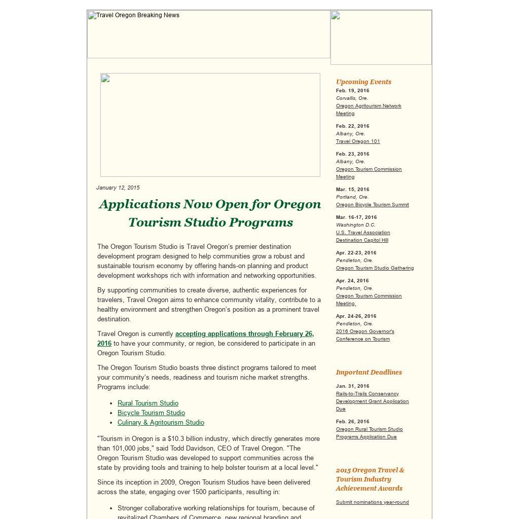 "Tourism in Oregon is a $10.3 billion industry, which directly generates more than 101,000 jobs," said Todd Davidson, CEO of Travel Oregon. "The Oregon Tourism Studio was developed to support communities across the state by providing tools and training to help bolster tourism at a local level."