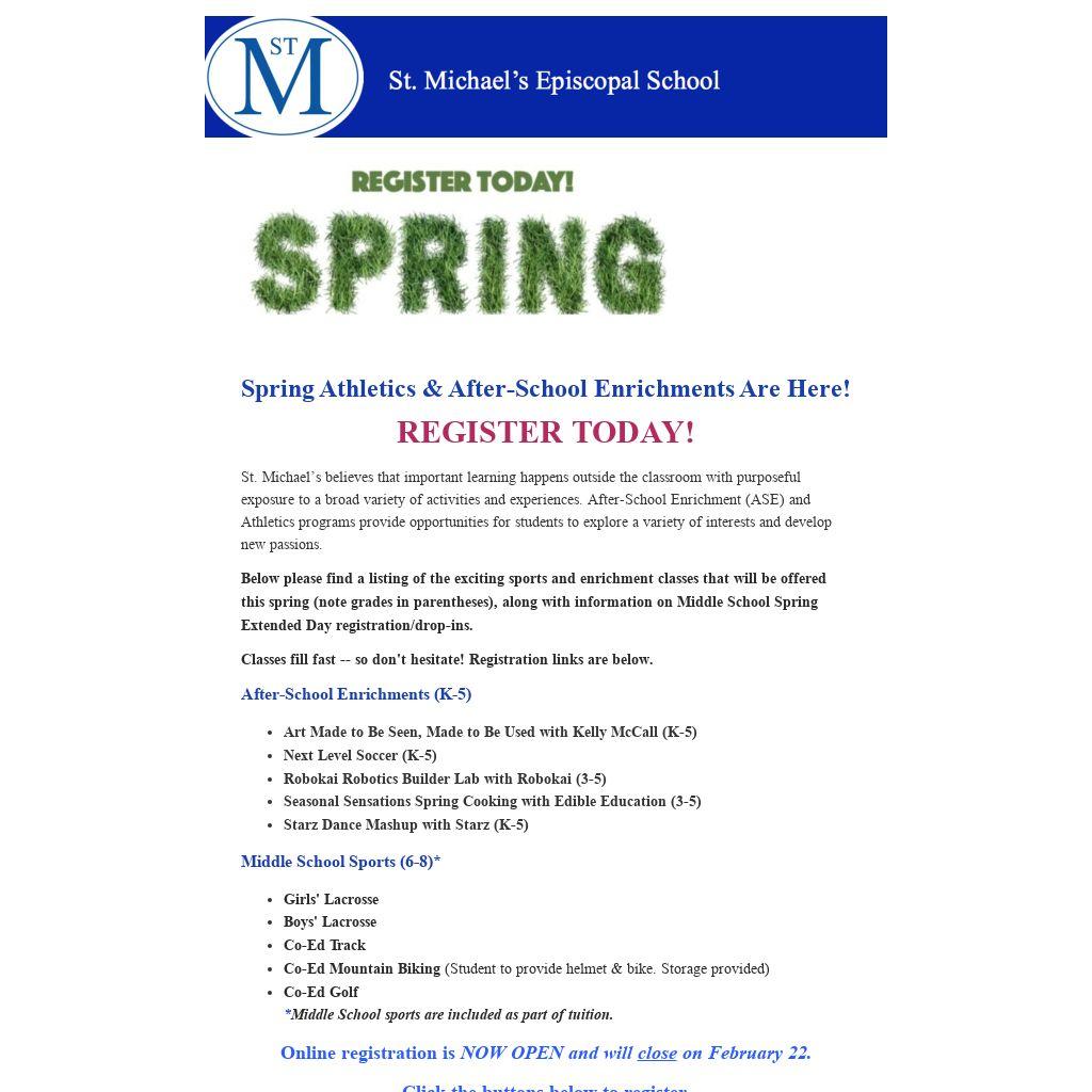 Extended Day is CLOSED on the following spring holidays: Mar 6 & 9-13, Apr 2, 3, 6, May 4 & 25.
