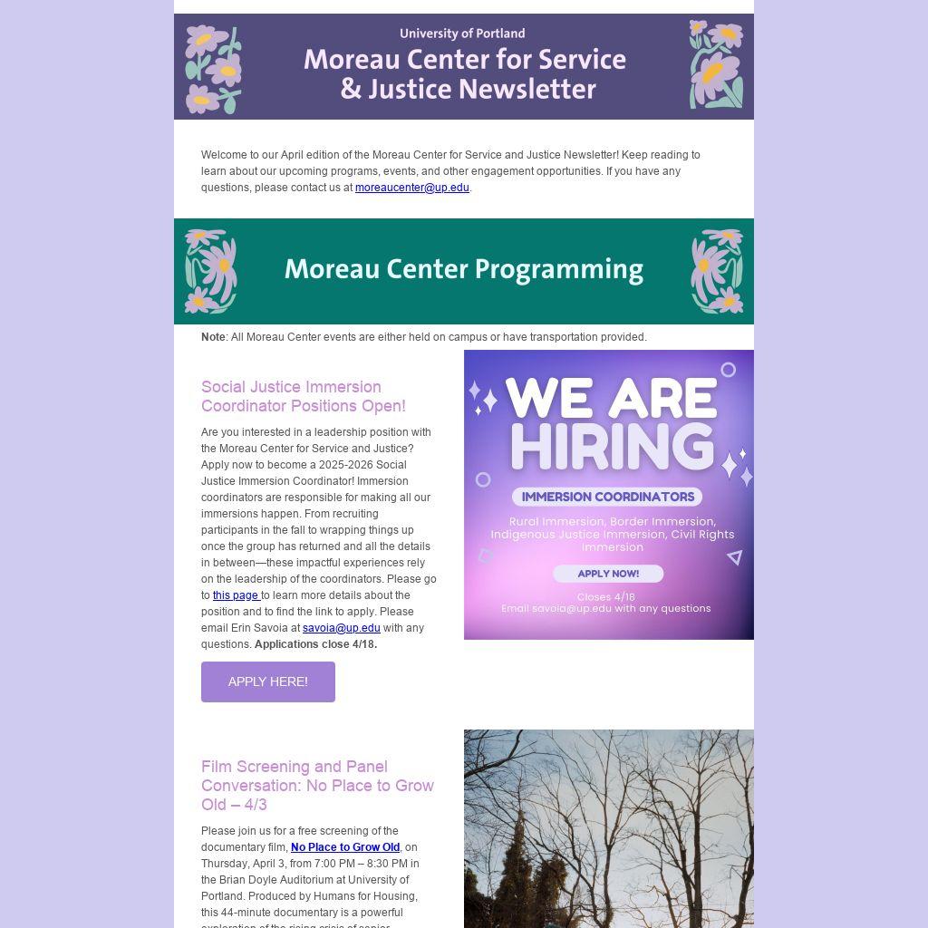 Welcome to our April edition of the Moreau Center for Service and Justice Newsletter! Keep reading to learn about our upcoming programs, events, and other engagement opportunities. If you have any questions, please contact us at moreaucenter@up.edu.