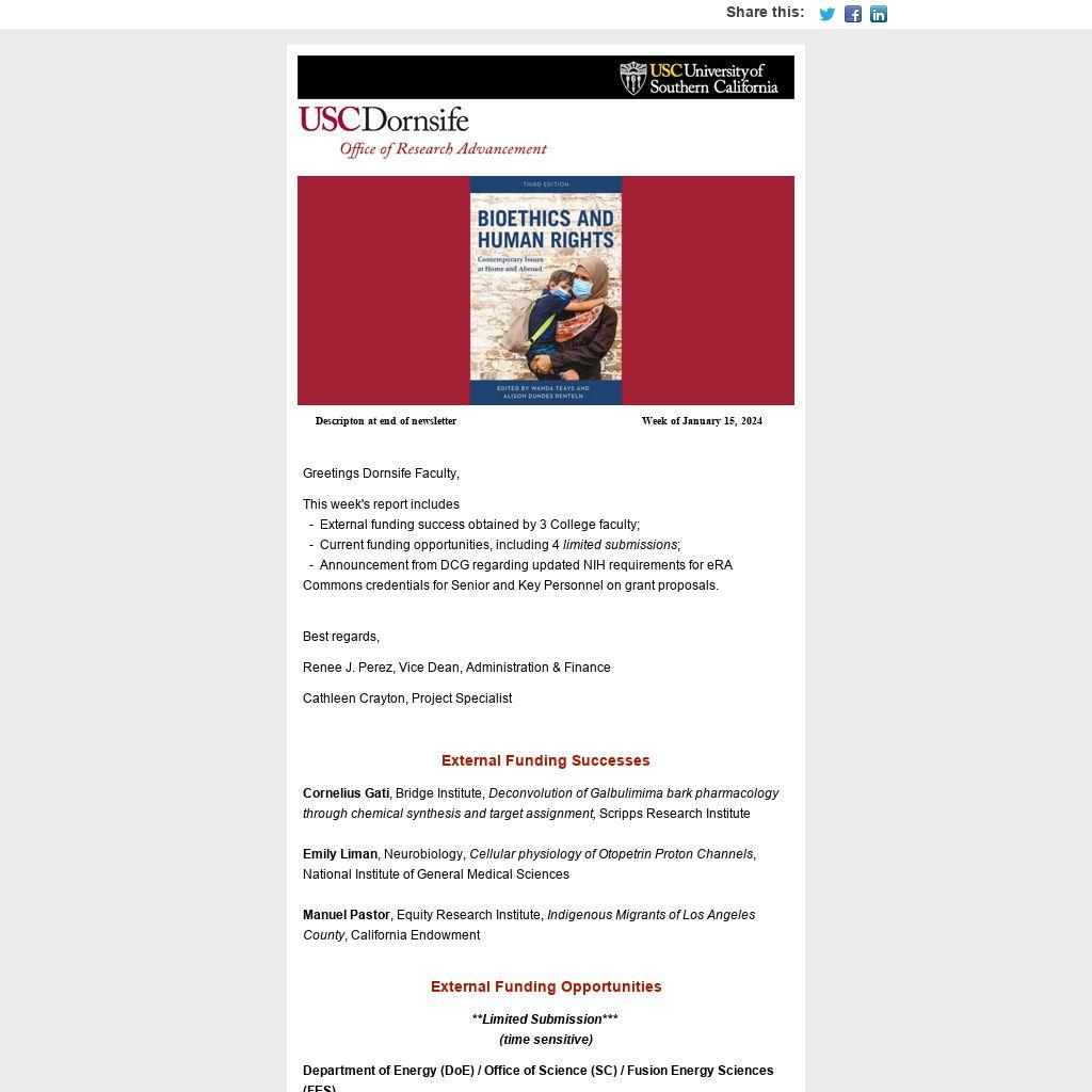 This week's report includes - External funding success obtained by 3 College faculty; - Current funding opportunities, including 4 limited submissions; - Announcement from DCG regarding updated NIH requirements for eRA Commons credentials for Senior and Key Personnel on grant proposals.