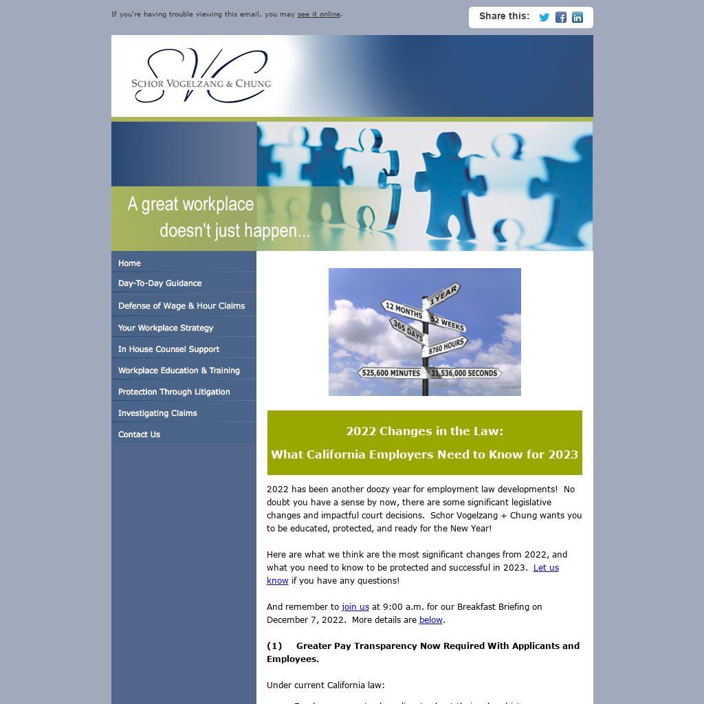 | 2022 has been another doozy year for employment law developments! No doubt you have a sense by now, there are some significant legislative changes and impactful court decisions. Schor Vogelzang + Chung wants you to be educated, protected, and ready for the New Year!